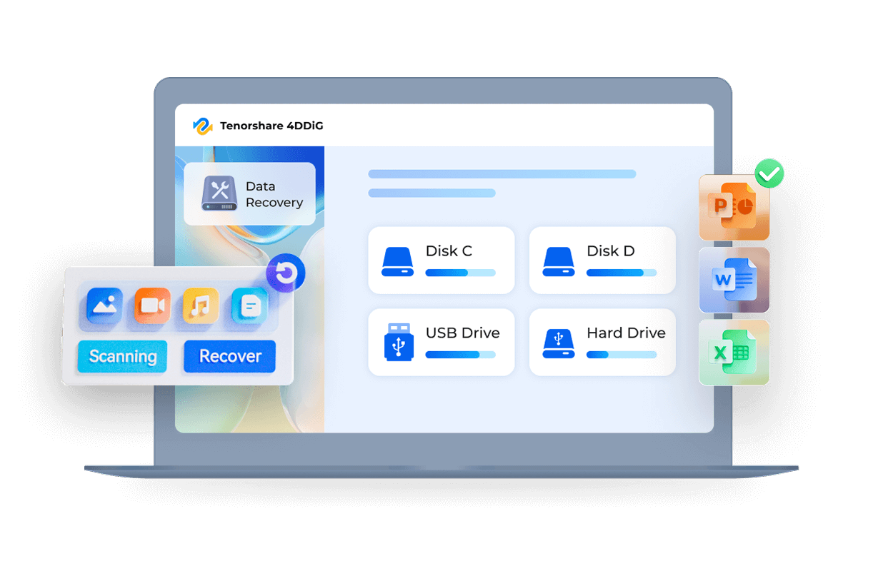 轻松检索任何已删除或丢失的文档、照片、视频等,帮助用户从硬盘、存储卡、SD卡、USB 驱动器、回收站等处恢复数据。支持恢复的主流文件格式占比高达 99.99%。